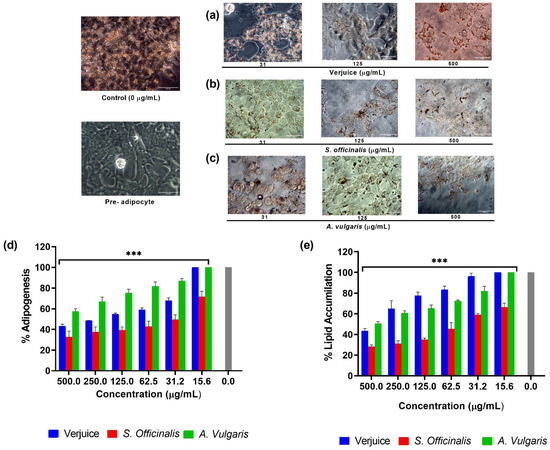 (a–c) Shows how different extracts (31, 125, and 500 μg/mL) from verjuice, S. officinalis, and A. vulgaris affect the amount of fat that accumulates in 3T3-L1-derived differentiated adipocytes. (d) The relative density of the lipid contents in 3T3-L1-derived differentiated adipocytes exposed to various extract concentrations (500 μg/mL to 0 μg/mL). (e) The relative density of lipid contents in completely developed adipocytes that were exposed to various extract concentrations for 5 days (days 10 to 15) (500 μg/mL to 0 μg/mL). Each bar represents the mean ± SD of three different experiments carried out in triplicate. The asterisk indicates statistically significant difference from control (untreated cells) which was calculated using a one-way ANOVA followed by Dunnett’s multiple comparisons test. (*** p < 0.001 vs. ctrl).