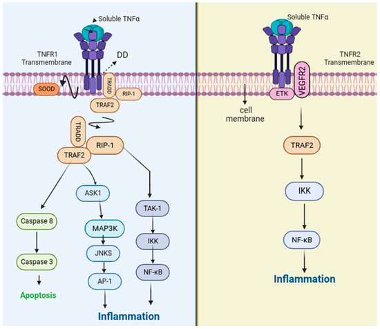 TNF-α-mediated signaling is dependent on binding to the TNF-R1 and TNF-R2 receptors. Receptors interact with the same and different molecules, which makes them capable of activating common and distinct pathways. TNF-R1 is more associated with the activation of pro-inflammatory and cell death pathways, while TNF-R2 is more associated with tissue repair and angiogenesis pathways [2,3,6,12,13].