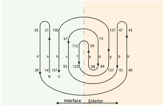 Each monomer of TNF-α forms an elongated and antiparallel β-sandwich, corresponding to a structure composed of two antiparallel β-sheets. In this case, these are pleated β-sheets, in which the amino groups (NH) of a fully extended β-sheet interacted by forming hydrogen bonds with the carbonyl groups (C=O) of the adjacent strand. The monomers have a jelly roll topology (Figure 4), which is defined as a supersecondary protein fold composed of eight β-strands (named from “a” to “h”) composed of two sheets of four strands [3,14,15,16,25,26,27].