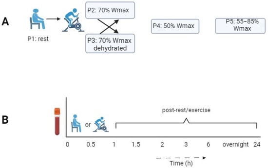 Schematic overview of the experimental protocols and the time points at which the blood samples were obtained. (A). An example of the exercise schedule for one subject. Each subject started with the rest protocol (P1) without exercise. Subsequently, they underwent four different exercise interventions (P2–P5), which were randomly assigned. The 70%-of-Wmax interventions in hydrated and dehydrated conditions were always performed in sequence. The washout period between protocols was 1 week. (B). Blood samples were taken before, during, immediately at the end of, and at several time points after the rest or exercise for up to 24 h.