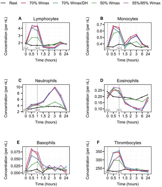 The kinetic changes in leukocyte subsets and thrombocyte counts (in counts/nL) at multiple time points during and after both rest and 1 h cycling (T0–T1) at varying intensities are depicted in the colored line graphs. The individual subsets are shown in the panel figures: lymphocytes (A), monocytes (B), neutrophils (C), eosinophils (D), basophils (E), and thrombocytes (F).
