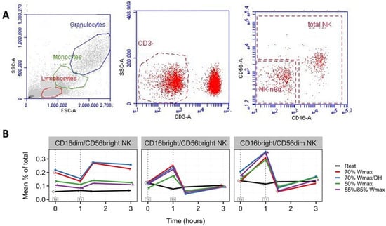 Circulating (CD3−CD16+CD56+) NK cells were gated based on their forward- and side- scatter properties (Figure 3A). During exercise, CD16-positive NK cells showed a proportional increase for the subpopulations of CD16bright cells compared to CD16dim cells. This increase was 1.5-fold for the subpopulation with the phenotype CD16brightCD56dim in all the exercise protocols compared to the subpopulation with the phenotype CD16brightCD56bright (Figure 3B), which showed an exercise-intensity dependency. For both CD16bright subpopulations, the peak levels at the end of the exercise (T1) declined beneath the baseline levels at 30 min post-exercise (T1.5) and returned to the baseline levels 2 h post-exercise (T3).