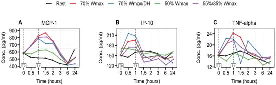 We analyzed a number of cytokines and chemokines, for which the serum levels of MCP-1 and IP-10 showed the greatest changes (Figure 4A,B). The increase in the MCP-1 levels during exercise was profound in all the high-intensity exercise protocols (P2, P3, and P5), while the increase in the IP-10 levels was more pronounced in a dehydrated condition (P3). The maximum MCP-1 levels were reached gradually at 0.5 h post-exercise (T1.5) and they decreased to the baseline levels at 5 h post-exercise (T6), whereas the IP-10 levels returned to the baseline levels shortly after exercise (T1.5). The TNF-α levels did not change significantly (Figure 4C). The serum levels of MIF, G-CSF, IFN-γ, IL-6, and IL-10 were also measured, but did not show significant changes (Supplementary Materials).