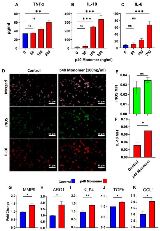 3.2. Treatment of Primary Murine Lung Macrophages with Recombinant p40 Monomer Induced Similar Pro- and Anti-Inflammatory Phenotypes in RAW 264.7 Cells