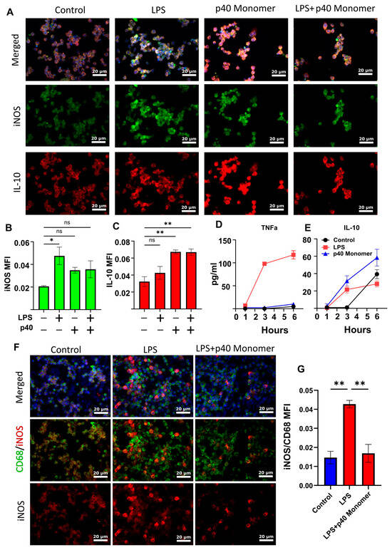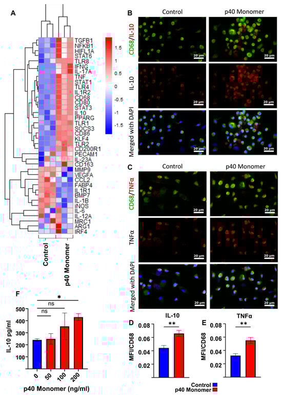 3.1. Recombinant p40 Monomer Treatment Induced the Expression of Anti-Inflammatory Cytokine IL-10, Pro-Inflammatory Cytokines, and Different Immunomodulatory Molecules in RAW 264.7 Macrophages