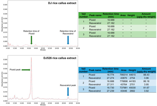 The piceid and resveratrol contents in the extracts of DJ and DJ526 callus extracts were measured by HPLC (Figure S1). The peak retention time for piceid was 16.688 min, while that of resveratrol was 27.182 min. Neither peak was detected in extract samples from DJ callus (Figure 1). In DJ526 extract, the mean (±SD) piceid content was 85.43 ± 3.44 µg/g dry weight, and that of resveratrol was 3.94 ± 0.02 µg/g dry weight. Thus, substantial amounts of these compounds remain in DJ526 rice callus after seed induction.