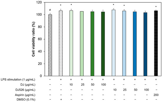 Low toxicities of DJ and DJ526 callus extracts. Concentrations up to 100 mg/mL had no effect on viable RAW264.7 cell numbers compared to untreated controls. The experiment was performed in triplicate (n = 3 for each replicate). Data are presented as mean ± standard deviation. * p < 0.05 vs. untreated controls; # p < 0.05 vs. cells treated with LPS alone.