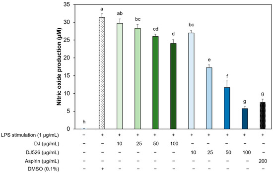 Suppression of LPS-induced NO production in RAW264.7 cells by DJ and DJ526 callus extracts. The experiment was performed in triplicate (n = 3 for each replicate). Data are presented as mean ± standard deviation. The increase in NO production induced by LPS was dose-dependently inhibited by DJ callus extract and more substantially by DJ526 callus extract enriched in resveratrol and piceid. The NO production by cells treated with LPS alone (“a”) is the reference value for statistical comparison. Letters (a–h) indicate significant differences (p < 0.05) between treatments (where a > b > c > d > e > f > g > h).