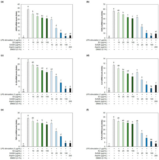 DJ and DJ526rice callus extract potently decreased the lipopolysaccharide-induced upregulation of proinflammatory genes in RAW264.7 cells. Pretreatment with DJ526 rice callus extract substantially reversed the LPS-evoked upregulation of (a) iNOS, (b) COX-2, (c) IL-1β, (d) IL-6, (e) TNF-α, and (f) TLR-4. The experiment was performed in triplicate (n = 3 for each replicate). Data are presented as mean ± standard deviation. The gene expression levels of LPS-treated cells (“a”) are the reference values for statistical comparison. Letters (a–g) indicate significant differences (p < 0.05) between treatments (where a > b > c > d > e > f > g).