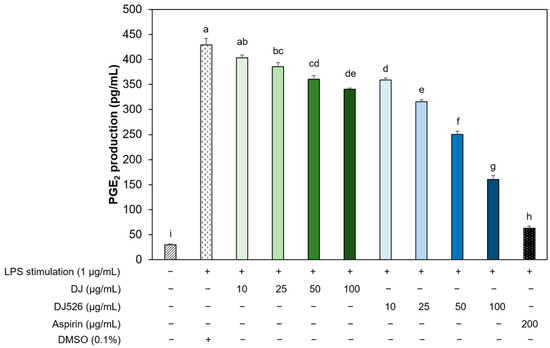 The DJ and DJ526 rice callus extracts dose-dependently inhibited LPS-induced PGE2 production by RAW264.7 cells. The experiment was performed in triplicate (n = 2 for each replicate). Data are presented as mean ± standard deviation. The PGE2 production by the LPS-treated cell group (“a”) is the reference value for statistical comparison. Letters (a–i) indicate significant differences (p < 0.05) between the treatments (where a > b > c > d > e > f > g > h > i).