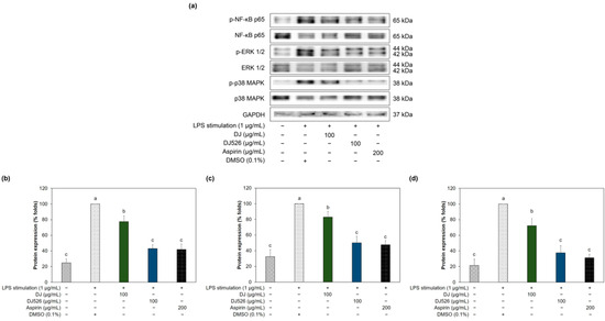 Stimulation of RAW264.7 cells with LPS also activated inflammation-associated MAPK pathways, as evidenced by increased phosphorylation of MAPK isoforms ERK-1/2 (p-ERK-1/2) and p38 (p-p38) (Figure 6). Further, LPS stimulation also increased phosphorylation of the NF-κB active unit p65 (p-NF-κB p65). Consistent with downregulation of inflammation-associated genes (Figure 4), many of which are known targets of MAPK and NF-κB signaling, these phosphorylation events were dose-dependently reduced by DJ rice callus extract and more potently by DJ526 rice callus extract. Also consistent with downregulation of target genes, the maximum effect of DJ526 rice callus extract was comparable to that of aspirin. Indeed, 10–100 µg/mL DJ526 rice callus extract suppressed LPS-induced activation of MAPK and NF-κB signaling pathways and the downstream upregulation of multiple proinflammatory factors. Moreover, peak effects at the highest concentration (100 µg/mL) were comparable to those of aspirin and were not associated with any substantial reduction in cell viability (Figure 2), while the higher concentrations (125 and 150 µg/mL) caused a reduction in cell viability (Table S1).