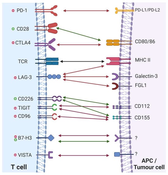 Immune checkpoints are important regulators of the immune system. They act as T-cell receptor (TCR) co-signalling partners, delivering either activating or inhibitory signals to T cells upon stimulation. These signalling pathways are vital for maintaining self-tolerance as well as ensuring an adequate immune response [19]. An example of a stimulatory checkpoint protein is the CD28 molecule, a protein highly expressed on CD4+ and CD8+ T cells, which initiates co-stimulatory signals when it binds to its corresponding ligands, CD80 and CD86, found on APCs [20]. To date, a total of seven other stimulatory checkpoints have been identified, all of which act in a similar way to activate and stimulate T-cell activity [19]. However, inhibitory immune checkpoints have been the main subject of attention in recent years. Their co-inhibitory pathways have been shown to promote tumour formation and progression, through the dampening of cancer immunosurveillance [21]. In fact, cancer cells have been shown to utilise these pathways by expression of their ligands, activating immunosuppressive signalling and allowing for immune evasion [22]. The therapeutic potential surrounding these pathways is evident, and since the success of the first ICI, ipilimumab, targeting CTLA-4, many more inhibitory immune checkpoints have been identified. As of now, the immune checkpoints which have been successfully targeted with approved ICIs are CTLA-4, PD-1 (CD279), its ligand PD-L1 (CD274) and LAG-3 (CD223) [5,10]. Other co-inhibitory immune checkpoints include T-cell immunoglobulin and mucin-domain-containing-3 (TIM-3, CD366), T-cell immunoglobulin and ITIM domain (TIGIT), V-domain Ig suppressor of T-cell activation (VISTA) and many more (Figure 1) [23]. These are all emerging ICI targets, currently under clinical trial or development, with many showing promising outcomes [23]. However, before we focus on what the future holds, it is important to understand the current established ICI targets, as ultimately it is their success and current limitations that are guiding research into these new targets. The next section will look in more depth at the physiological roles of these immune checkpoints, the mechanism of their blockade by ICIs and analyse the success of this immunotherapy in treatment of advanced cancers.
