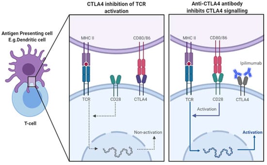 CTLA-4 is a transmembrane protein belonging to the immunoglobulin superfamily, and its expression and function are intrinsically linked to T-cell activation [8,19]. In fact, CTLA-4 is not detectable on naïve T cells but is immediately induced and upregulated in response to TCR activation [21]. Its expression is regulated by the strength of TCR signalling, whereby stronger TCR signalling induces greater expression of CTLA-4 [24]. CTLA-4 is a homologue of the co-stimulatory checkpoint CD28 and, as such, shares its ligands, CD80 (B7-1) and CD86 (B7-2), also known as the B7 ligands [21]. Following its expression, it begins to compete with CD28 for the B7 ligands; however, as it boasts a higher affinity and avidity for these ligands, it can effectively outcompete CD28, blocking co-stimulatory signals and attenuating T-cell activation [24]. Thus, it regulates the availability of B7 ligands to CD28, forming a homeostatic feedback loop in response to TCR stimulation. The net outcome following TCR stimulation is dependent on the relative binding of CD28 versus CTLA-4 to the B7 ligands and can result in either T-cell activation or anergy [25]. Other than its primary cell-intrinsic role in regulating T-cell activity, it also influences immunological tolerance through cell-extrinsic mechanisms, mainly through the action of T-regulatory cells (T-reg) [21]. Unlike effector T cells, CTLA-4 is constitutively expressed on T-reg cells, a cell with a key role in maintaining immune tolerance [26]. CTLA-4 expressed on T-reg cells acts in a similar way, limiting the availability of B7 ligands, in a cell-extrinsic manner, and blocking CD28 costimulatory activation of nearby effector T cells through competitive inhibition [21]. Additionally, beyond just the binding of B7 ligands, CTLA-4 has also been reported to limit the overall availability of B7 ligands through trans-endocytosis of these ligands from APCs [27]. It is quite evident that CTLA-4’s function is inherently linked to the interaction of its homologue CD28 and its ligands, as its primary mechanism is to impede this signalling. However, some evidence suggests that CTLA-4 may also have a role independent of CD28, in which it directly antagonises TCR signalling following B7-1 engagement, through its own cell-intrinsic signalling [28]. A proven mechanism has yet to be established, and further research is needed to understand the intracellular signalling of CTLA-4. Ultimately, CTLA-4 has a fundamental role in maintaining self-tolerance, and as such, it primarily regulates T-cell activation at sites of T-cell priming, such as lymph nodes [21]. Its critical role in immune tolerance has been proven by observations seen in CTLA-4 knockout mice, which developed uncontrolled lymphoproliferative disease and fatal autoimmunity, due to unrestrained CD28 co-stimulation [29].