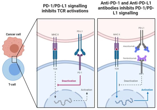 Tumour cells can express PD-L1, which can directly bind to inhibitory immune checkpoint PD-1 on the surface of T cells. PD-1:PD-L1 binding induces co-inhibitory signalling that inhibits TCR activation. Anti-PD-1 antibodies, such as pembrolizumab, and anti-PD-L1 antibodies, such as atezolizumab, inhibit PD:PD-L1 signalling, allowing unrestrained TCR activation. Figure generated using BioRender.com.