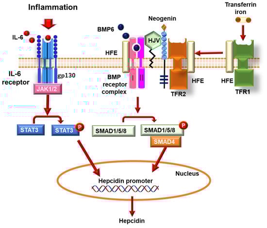 Hepcidin is a peptide hormone produced in the liver that plays a central role in the regulation of iron metabolism. The regulatory mechanism of its expression is complex and involves multiple genes and pathways. The BMP/SMAD pathway, the HFE/TFR2 pathway, and the IL-6/STAT3 pathway are known as major pathways for the regulation of hepcidin expression. Hepcidin expression is regulated by body iron levels via BMP/SMAD and HFE/TFR2 pathways or by inflammation, including ACD, via the IL-6/STAT3 pathway. HJV functions as part of a complex in the BMP/SMAD pathway. Although there is no evidence that HJV is directly involved in the IL-6/STAT3 pathway associated with inflammation, as discussed below, HJV may be deeply involved in ACD.