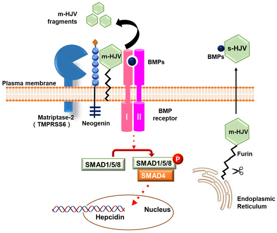 HJV cleavage and regulation of hepcidin expression. Membrane-bound HJVs (m-HJVs) are present on the plasma membrane and facilitate BMP signaling; BMPs initiate signaling by binding to BMP receptors, which are activated by this binding and phosphorylate SMAD1/5/8, which in turn bind SMAD4 and a complex is formed. This complex migrates to the nucleus and activates the transcription of hepcidin genes; the interaction between Neogenin and m-HJV is required for this sequence of hepcidin expression regulation. Thus, cleavage of m-HJV by Matriptase-2 (TMPRSS6) suppresses hepcidin expression. m-HJV and the protein complex of Neogenin and TMPRSS6 facilitate the cleavage of m-HJV by TMPRSS6. Green hexagons indicate the m-HJV fragments resulting from this cleavage in the diagram. In contrast, soluble HJV (s-HJV) is an antagonist of BMP signaling. Furin cleaves HJV in the ER to generate s-HJV. s-HJV acts as a decoy receptor for BMP signaling and prevents BMPs from binding to m-HJV, thereby blocking hepcidin expression. In other words, s-HJV suppresses the BMP/SMAD signaling pathway and reduces hepcidin expression.