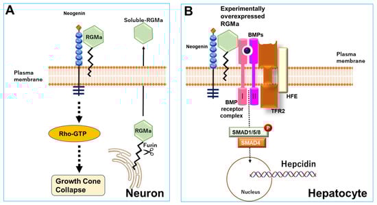 RGMa signaling pathways in different cell types. (A) RGMa signaling pathways in neurons. The binding of RGMa to the Neogenin receptor induces Rho-GTP activation. Activated Rho-GTP induces growth cone collapse and inhibition of axon outgrowth through downstream signaling pathways; RGMa is cleaved by Furin and released extracellularly as soluble RGMa (soluble-RGMa), which may have different effects than membrane-bound RGMa. (B) RGMa signaling pathways in liver cells. RGMa is expressed primarily in the central nervous system. However, ectopic expression of RGMa in hepatocytes has been shown to activate hepcidin gene transcription; RGMa functions as a co-receptor for BMPs and interacts with HFE and TFR2, leading to hepcidin transcription via BMP/SMAD signaling.