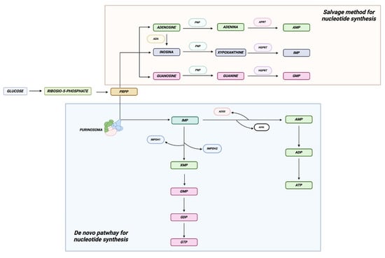 Purine synthesis. The figure depicts the two principal pathways regulating the synthesis of purine nucleotides. The de novo pathway, involved in the synthesis of new purine nucleotides, serves cells with elevated energy requirements, while the salvage pathway is utilized by cells with lower energy demands. Created in BioRender.com.