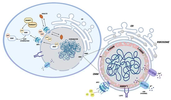 Nuclear envelope and nuclear-cytoplasmic transport. The figure illustrates the structure of the nuclear envelope, delineating its various components (nuclear pores, ion channels, lamins, etc.) and the mechanisms that regulate nuclear-cytoplasmic transport. This process is mediated by the RAN-RANGAP1-RANBP1 pathway, which establishes a GDP/GTP gradient, and by cytoplasmic ribonucleoprotein “vaults”, which have recently been demonstrated to play a pivotal role in diverse biological processes. Created in BioRender.com.