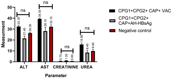 Blood biochemical profiles function as a crucial diagnostic instrument by indicating the physiological condition of the animal [16]. Therefore, the renal biochemical profile was evaluated by the analysis of urea and creatinine levels to assess the potential damage of the adjuvant combination on kidney function, while ALT and AST were evaluated to check any potential damage to the liver. The result showed no statistically significant differences between the CPG1 + CPG2 + CAP-supplemented and the untreated groups (p > 0.05). So, the result reveals no toxicity profile of the optimized combination on the liver and kidney function of the Balb/c mice.