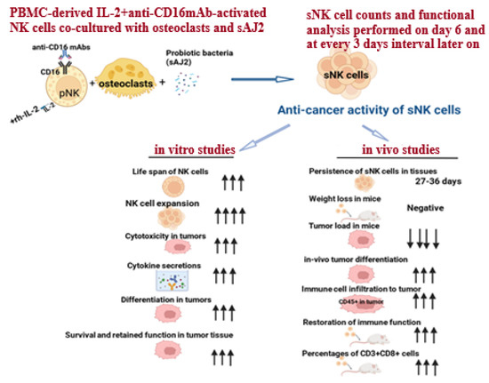 Supercharged NK (sNK) cell generation is performed by co-culturing peripheral blood-derived IL-2 and anti-CD16 mAb-activated NK cells with osteoclasts (OCs) and sonicated probiotic bacteria (sAJ2) (Figure 1). Osteoclasts were found to exhibit a positive surface expression of MICA/B, KLRG1, and ULBPs; these are ligands for NK cell-activating surface receptors. Osteoclasts also secrete a wide range of cytokines and chemokines, including IL-12, IL-15, IFN-γ, and IL-18, which are known to activate NK cells [61,62]. Thus, surface markers and the secreted factors of osteoclasts play a significant role in cell expansion and the functional activation of NK cells. Gram-positive probiotic bacteria Streptococcus thermophiles, Bifidobacterium longum, Bifidobacterium breve, Bifidobacterium infantis, Lactobacillus acidophilus, Lactobacillus plantarum, Lactobacillus casei, and Lactobacillus bulgaricus were selected based on their activation in NK cells. The combination of these probiotic treatments in NK cells was found to increase cytokine secretion by NK cells, including IFN-γ, which could facilitate the signals required for NK cell expansion [28,39,52,63]. Therefore, a combination treatment of both probiotics and OCs in NK cells results in the induction of signals participating in cell expansion and the functional activation of NK cells, generating sNK cells. sNK cells have demonstrated increased lifespan, cell expansion, cytotoxicity, and the secretion of cytokines; these sNK cell characteristics ultimately result in the increased differentiation and killing of oral cancer both in vivo and in vitro [52,58,59]. sNK cells’ characteristics and increased functions are discussed in the next sections of this review.