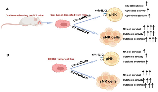 Tumor microenvironment-induced suppressed function or cell death in primary NK cells was demonstrated, and reduced NK cell function was also seen when NK cells were co-cultured with tumors in vitro [69]. When primary NK cells and sNK cells were exposed to oral tumors dissected from hu-BLT mice or with OSCSCs, in both cases, primary NK cells expressed minimal survival and lost function, but sNK cells survived longer and retained their function (Figure 2). This indicates the persistence or continued anti-cancer effect of sNK cells in the tumor microenvironment, validating the fact that this approach is best for treating oral tumors.