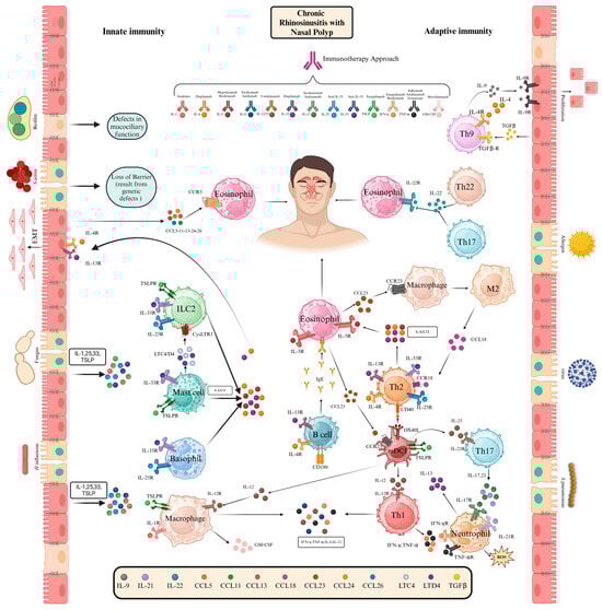 Eosinophilic and non-eosinophilic CRSwNP represent distinct inflammatory subtypes with different immunopathological mechanisms and clinical implications. Eosinophilic CRSwNP is predominantly characterized by type 2 inflammation, driven by elevated levels of cytokines such as IL-4, IL-5, and IL-13 [,]. These cytokines play critical roles in sustaining eosinophil activation and prolonging their survival, promoting tissue damage through the release of cytotoxic granules and inflammatory mediators. The severity of eosinophilic inflammation is strongly associated with biomarkers such as periostin, which reflects the underlying type 2 immune response []. Additionally, disruptions in epithelial barrier integrity, exacerbated by histone deacetylase activity and the enhanced production of IL-13 and prostaglandin D2 (PGD2) via secretory phospholipase A2 group IIB (sPLA2GIB), contribute to the persistence and amplification of eosinophilic inflammation [,]. In contrast, non-eosinophilic CRSwNP is characterized by a Th1/Th17 immune response, with a predominant infiltration of neutrophils and elevated levels of pro-inflammatory cytokines such as IL-17 and TNF-α [,]. Neutrophil-dominant inflammation is often associated with chronic bacterial infections, which perpetuate local immune activation. Elevated levels of calprotectin serve as a hallmark of neutrophil activity in this subtype []. Chemokines play a pivotal role in the recruitment of eosinophils to inflammatory sites in eosinophilic CRSwNP. The CCR3 receptor, predominantly expressed on eosinophils, interacts with a range of chemokines, including MCP-4 (CCL13), RANTES (CCL5), and the eotaxins (CCL11, CCL24, and CCL26) []. Elevated levels of eotaxin-1, -2, and -3 have been observed in eosinophilic nasal polyps, correlating strongly with eosinophil accumulation and the progression of inflammation. These chemokine-driven mechanisms underscore the central role of eosinophil recruitment in the pathogenesis of eosinophilic CRSwNP and offer potential therapeutic targets for managing this subtype [,]. The distinct immunopathological mechanisms underlying eosinophilic and non-eosinophilic CRSwNP have paved the way for the development of targeted therapies tailored to the specific inflammatory patterns of each subtype [,]. Additionally, external factors like smoking have been shown to alter immune responses, exacerbating local inflammation and highlighting the interplay between environmental triggers and innate immune mechanisms. Non-eosinophilic CRSwNP also involves autoantibody production and dysregulated local immunoglobulin E (IgE) synthesis, suggesting a complex interaction between innate and adaptive immune pathways [].