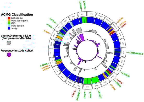 Overall demonstration of the variants via a circular plot. The outermost layer displays the gene names, while the next layer uses a heatmap format to show the number of variants detected per gene, with the colors corresponding to their ACMG classification based on Franklin genoox. The third layer consists of a bar plot representing the allele frequency of each variant (using gnomAD–exomes data for the European non-Finnish population), and the innermost layer is a bar plot indicating the number of patients in which each variant was identified.