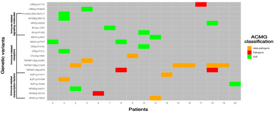Genetic variants, in at least one patient, were detected across 25 out of the 30 genes studied (Figure 1). No variants were identified in the IL21, PIK3CD, PRKCD, RAG2, or TAPA-1 (CD81) genes. In total, 103 variants were detected and classified according to the ACMG guidelines: three pathogenic, six likely pathogenic, 12 variants of uncertain significance (VUS), five likely benign, and 77 benign (Figure 1). The pathogenicity predictions via the bioinformatic tools (SIFT, Polyphen2 and Mutation Taster) for the missense and stop-gainedvariants classified as pathogenic, likely pathogenic, or VUS are presented in Table S1. A descriptive interpretation of all the detected variants, their classification (ACMG guidelines), and their allele frequency in the European population is displayed in Table S2. The pathogenic, likely pathogenic variants and VUS detection for each patient are visualized in Figure 2, are listed in Table S3 and are presented in the following sections.