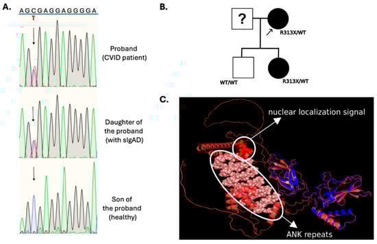 Genetic analysis, family testing and 3D visualization for the NFKB2-pR313X defect. (A) Sanger sequencing chromatograms for the proband and tested relatives. (B) Family tree illustrating the genetic testing results for the proband (indicated by arrow) and relatives. (C) Three-dimensional protein visualization of the wt NFKB2 (red) vs. mutated (blue) protein: the artificial intelligence (AI)-driven protein folding predictions generated with Alphafold3 for both the wild-type and mutated protein molecules. Using PyMOL for visualization, the wild-type protein (red) was aligned with the mutated protein (blue) to emphasize the structural alterations and potential loss of protein domains. The ANK repeats and nuclear localization signal of NFKB2 are additionally highlighted.