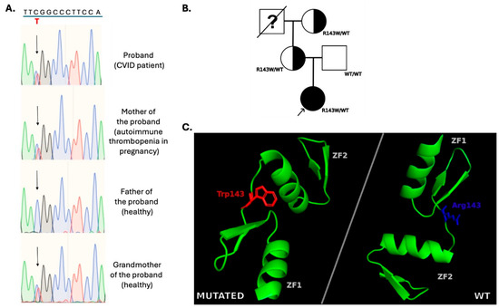 A heterozygous missense variant was identified in exon 5 of the IKZF1 gene (NM_006060.6: c.427C>T/p.R143W) in a female patient displaying recurrent respiratory infections and hypothyroidism (#3 in Table 1). Classified as likely pathogenic by the ACMG criteria, this variant has an allele frequency of 0.0002% in Europeans and is reported in ClinVar as likely pathogenic (variant index: 2907372). The variant was characterized as deleterious/probably damaging by the in silico predictors, and it was also found in the patient’s mother and grandmother (Figure 5B, family tree). The mother suffers from IgG4 deficiency, displaying an episode of autoimmune thrombocytopenia during pregnancy, while the grandmother does not show a CVID phenotype. The structural 3D interpretation of the variant location (between zinc-finger domains 1 and 2) regarding the superposition of the wt molecule with the mutated one (IKZF1: p.R143W) is visualized in Figure 5C and the family testing chromographs from the Sanger sequencing are displayed in Figure 5A.