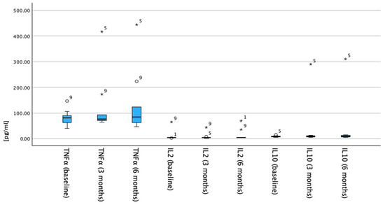 Timeline trends of serum cytokine levels (TNF-α, IL-2, and IL-10) in patients with melanoma. Cytokine concentrations (x-axis) are displayed at baseline, 3 months, and 6 months after anti-PD-1 start date. Each set of box plots shows distribution per cytokine. Median values with interquartile ranges are plotted; error bars represent full range. First three box plots depict TNF-α levels with increase from baseline to 6 months. Next three boxplots illustrate IL-2 levels, which remain low and stable over timeline. Final three boxplots show IL-10 levels, which are elevated at 3 months and decrease at 6 months. Outlier values are indicated by circles and asterisks above respective boxplots.