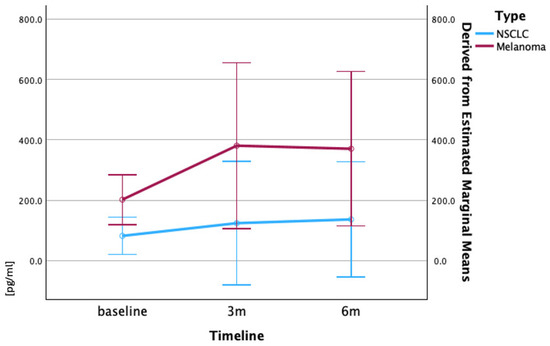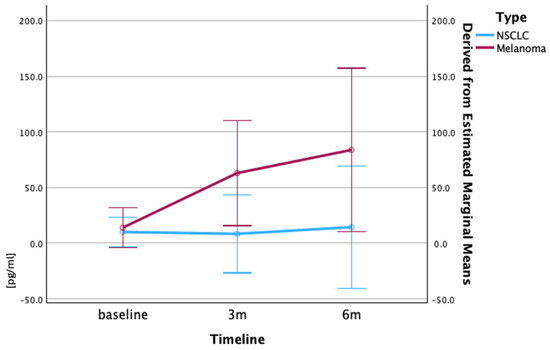 The most striking differences were observed in the IL-10 levels, where the patients with melanoma exhibited baseline concentrations nearly 12-fold higher than those of the patients with NSCLC (103.5 pg/mL versus 8.4 pg/mL). The patients with NSCLC showed a modest, but consistent increase in IL-10 levels from the baseline (8.4 pg/mL) to 3 months (39.4 pg/mL) and 6 months (42.1 pg/mL). The patients with melanoma demonstrated massive elevations in IL-10 levels, increasing from the baseline (103.5 pg/mL) to 1071 pg/mL at 3 months and reaching 885.5 pg/mL at 6 months, representing a more than five-fold increase from the already elevated baseline levels (Figure 5).