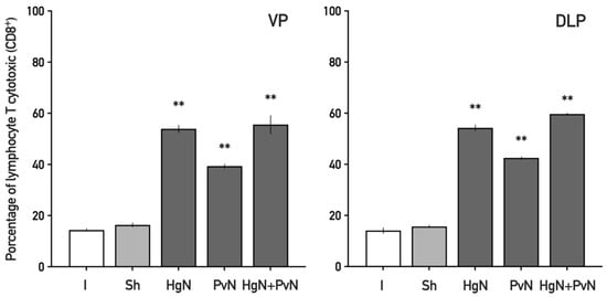 Cytotoxic T lymphocytes (CD8+) (Figure 5) were also elevated across both lobes. In the ventral prostate, increases of ~56% with Hg axotomy, ~42% with Pv axotomy, and ~68% with double axotomy were observed. Similar trends were noted in the dorsolateral lobe, indicating a consistent cytotoxic T cell response to nerve injury.
