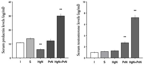 Blood samples were collected via cardiac puncture, allowed to clot, centrifuged (3500 rpm, 10 min) at room temperature, and serum was separated and stored at −20 °C. Testosterone, prolactin, and interleukin levels (IL-1β, IL-6, IFN-γ, and IL-10) were quantified using ELISA as per the manufacturer’s instructions.
