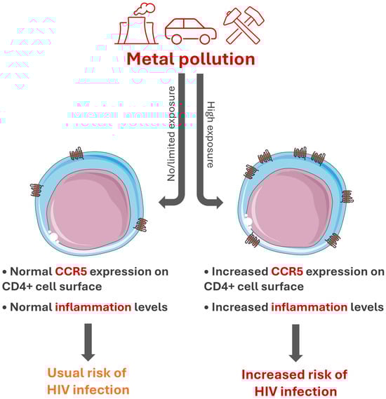 Exposure to metal pollution induces inflammation and elevated CCR5 expression on the surface of CD4+ cells, thereby enhancing the availability of this viral co-receptor and subsequently amplifying the risk of HIV infection (Figure 1).