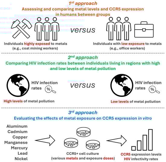 Approach (I): Going beyond our toxicogenomic analysis, we suggest conducting studies that evaluate metal levels and CCR5 expression in humans, in a combined manner. Importantly, it is necessary to control CCR5 expression levels by genetic factors such as the variant CCR5Δ32, which robustly affects CCR5 expression []. An evaluation could include the analysis of CCR5 expression in peripheral T cells of individuals differentially exposed to metals and related compounds. For instance, it would be valuable to evaluate coal mining workers by simultaneously assessing metal levels and CCR5 expression, and comparing the results with those of control individuals (e.g., office workers) from the same regions. It is also necessary to take into consideration that the CCR5 expression on the cell surface is transient. That is, CCR5 is externalized in the cell in response to a stimulus and then internalized to be recycled []. This process may complicate the observation of direct associations between metal exposure and CCR5 protein expression. Therefore, analyzing CCR5 mRNA levels may be a better option.