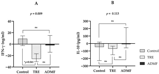 Table 3 presents within-group comparisons of IFN-γ and IL-10 levels between the baseline and post-intervention. No significant changes in IFN-γ levels were observed in the control (p = 0.123) and ADMF groups (p = 0.866), while a significant reduce was observed in the TRE group (p = 0.025). Regarding IL-10, no significant changes were observed in any of the groups (p > 0.05). Between-group analysis showed a significant difference in IFN-γ changes (p = 0.009; Figure 1A), whereas IL-10 levels remained stable across groups (p > 0.05; Figure 1B). Further post hoc testing using Tukey’s HSD indicated that TRE induced a significantly greater reduction in IFN-γ compared to the control group (p = 0.041). However, no significant differences were detected between the control and ADMF groups or between ADMF and TRE groups.