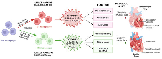 Macrophage polarization and its impact on cardiomyopathy. Naïve M0 macrophages differentiate into M1 (classically activated) or M2 (alternatively activated) states depending on the specific stimuli. M1 macrophages induced by IFN-γ, TNF-α, GM-CSF, and LPS express CD80, CD86, and MHC-II, secrete pro-inflammatory mediators (TNF-α, IL-1β, IL-6, IL-12, ROS, and NO), rely on glycolytic metabolism, and contribute to cardiomyocyte injury. M2 macrophages are induced by IL-4, IL-13, TLR ligands, and adenosine, express CD163, CD206, and Arg1, secrete IL-10, TGF-β, VEGF, and chemokines (CCL17, CCL22), utilize oxidative metabolism, and promote anti-inflammation and cardiac repair. (Created with BioRender.com, Toronto, ON, Canada). Abbreviations: ROS, reactive oxygen species; NO, nitric oxide; TME, tumor microenvironment.