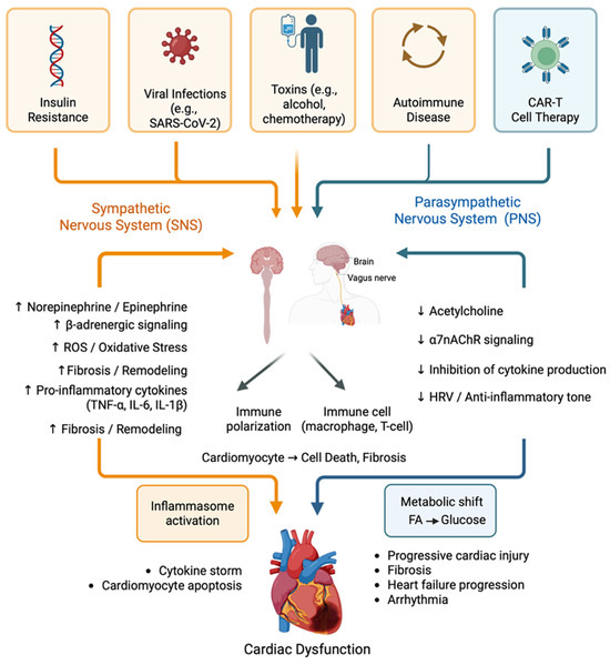 Integrated schematic of the immunoneural axis in cardiomyopathy. The diagram illustrates the bidirectional interplay between the autonomic nervous system (sympathetic and parasympathetic branches) and the immune system (innate and adaptive) in cardiomyopathy pathogenesis. Systemic triggers, including insulin resistance, viral infections, toxins, autoimmune conditions, and CAR-T cell therapy, initiate dysregulation of this axis. Sympathetic overactivation promotes pro-inflammatory cytokine production (TNF-α, IL-1β, and IL-6), oxidative stress, metabolic dysfunction, and adverse cardiac remodelling. In parallel, parasympathetic withdrawal impairs the cholinergic anti-inflammatory pathway mediated by acetylcholine and α7-nicotinic receptors. These disruptions converge to drive immune polarization, inflammasome activation, cytokine storms, and progressive cardiac injury. The figure highlights the key feedback loops that reinforce neuroimmune dysregulation and create a self-sustaining cycle of inflammation and cardiac dysfunction. (Created with BioRender.com, Toronto, ON, Canada).