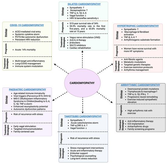 Overview of cardiomyopathy subtypes, including their characteristic etiologies, prognostic implications, and current treatment strategies. Dilated cardiomyopathy is primarily driven by sympathetic overactivation, inflammatory cytokines, and vagal dysfunction, with poor long-term survival despite neurohormonal blockade therapy. Hypertrophic cardiomyopathy involves macrophage/fibroblast activation and arrhythmogenic remodelling, with a persistent risk of sudden death despite the use of β-blockers and myosin inhibitors. Arrhythmogenic cardiomyopathy is associated with desmosomal mutations, immune cell infiltration, and neural remodelling, with treatment centered on arrhythmia suppression and ICD implantation. Takotsubo cardiomyopathy reflects acute catecholamine surge and autonomic dysfunction, with recurrence risk linked to stress, whereas pediatric cardiomyopathies reflect immune immaturity and viral triggers, requiring age-specific immune modulation. COVID-19 cardiomyopathy combines viral entry via ACE2, cytokine storm, and persistent autonomic dysfunction, with long COVID sequelae complicating management. (Created with BioRender.com, Toronto, ON, Canada).