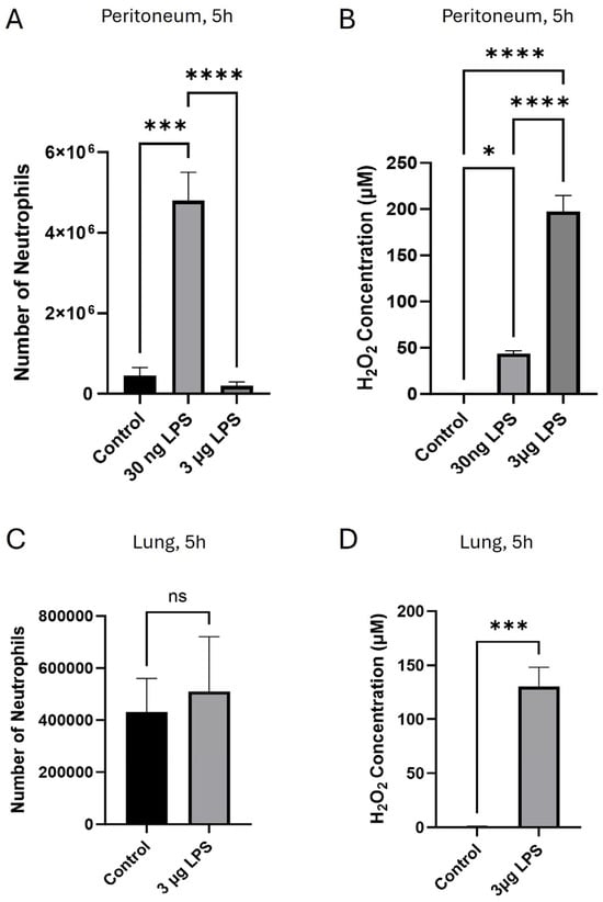 We used a low dose of LPS (30 ng, c. 0.15 mg/kg, i.p.) to induce a localised peritoneal inflammation, and in parallel experiments, we injected a 100× higher LPS concentration (3 µg, c. 15 mg/kg, i.p.) to model a more severe bacterial infection [,,] (Figure 1). The lower LPS concentration caused neutrophil invasion into the peritoneum 5 h after injection (Figure 1A), similar to results reported previously [], and also caused the release of around 40 µM H2O2 in the peritoneum (Figure 1B). However, at a higher dose of 3 μg LPS, no neutrophil chemotaxis to the injection site was seen (Figure 1A), a phenomenon sometimes referred to as neutrophil paralysis. The peritoneal H2O2 concentration, at around 200 µM, was significantly higher than with the 30 ng LPS dose (Figure 1B). The 3 μg dose of peritoneal LPS also induced no increase in neutrophil entry into the lung (Figure 1C) and elevated the concentration of H2O2 in the lung to around 130 μM (Figure 1D), suggesting that neutrophil migration was paralysed. (Lung neutrophils were not assessed following 30 ng i.p. LPS, as this dose induces only a localised peritoneal infection, not expected to have a system-wide effect and thus induce lung inflammation.)