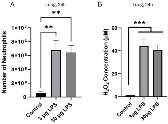 H2O2 released in response to i.p. injection of high LPS (≥3 μg) is reduced at 24 h, allowing neutrophil entry to the lung. (A) Strong invasion of neutrophils into the lung was similar 24 h after injection of 3 μg and 30 μg LPS; (B) H2O2 concentrations in the lung were similar (c. 40 µM) 24 h after injection of 3 μg and 30 μg LPS. Bars show the mean ± SEM, N = 6 mice per bar, with 6 independent experiments per result. ** p < 0.01, *** p < 0.001 (one-way ANOVA and Tukey–Kramer post hoc test).