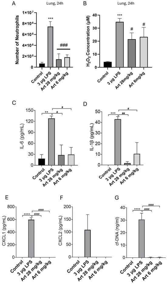 In previous work, we showed that artesunate, an antimalarial, can significantly reduce neutrophil invasion and the levels of cytokines, chemokines and NETs released from neutrophils following an inflammatory stimulus directly applied to the peritoneum or lungs []. In Figure 3, we extend this work to off-target organs by showing that artesunate at a concentration of 6 mg/kg, close to clinically used doses for the treatment of malaria, together with a higher dose of 28 mg/kg, both cause a significant inhibition of neutrophil recruitment to lungs (Figure 3A) following injection of a high dose of LPS into the peritoneum to model a severe bacterial infection. Artesunate, however, had a much lesser effect on H2O2 levels in the lungs (Figure 3B), and the small effect is likely to be a by-product of inhibiting neutrophil chemotaxis and thus reducing neutrophil-mediated contribution to H2O2 levels through ROS release. Artesunate also caused near-complete inhibition of cytokine, chemokine and NET release in the lungs (Figure 3C–G). These results are similar to those obtained with the direct injection of inflammatory stimuli into the peritoneum or lung [], and they suggest that artesunate may have therapeutic value in off-target organs, as well as in those directly targeted by an infection.