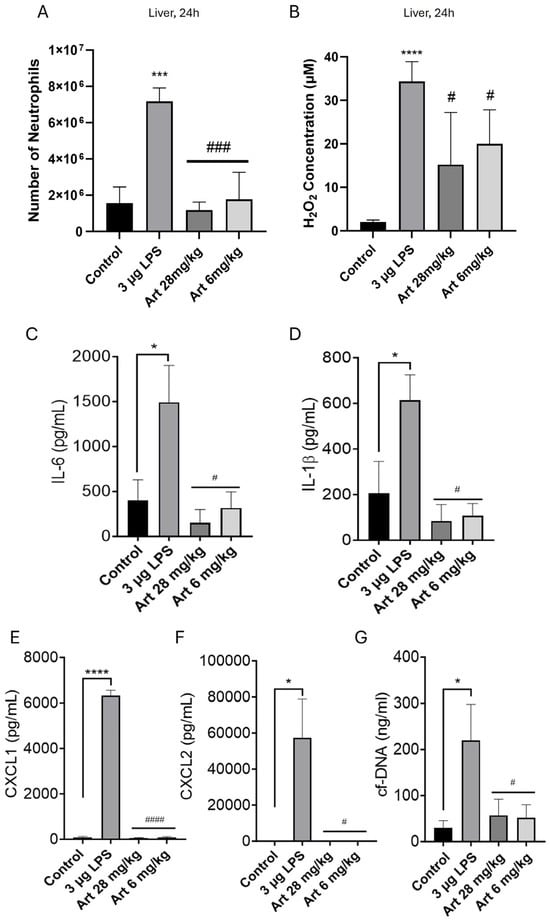 Injection of LPS i.p. increases liver neutrophils, H2O2, pro-inflammatory cytokines, chemokines, and NETs. Artesunate inhibits the increase in liver neutrophils, pro-inflammatory cytokines, chemokines and NETs, but has a lesser effect on H2O2. Similar experiment to Figure 3 (where Figure 3A–G correspond here to (A–G)), except that lavage fluid was obtained from the liver (see Section 2). Bars represent mean ± SEM. N = 4 mice per bar, with 4 independent experiments per result. Results with no visible bars were below the assay detection limits (see Section 2) and, for statistical purposes, were assumed to be equal to the detection limit. * for comparison between control and LPS to show the effect of LPS injection vs. sham, # for comparison between LPS and artesunate groups, to show the effect of artesunate on LPS-treated groups. * p < 0.05, *** p < 0.001, **** p < 0.0001, # p < 0.05, ### p < 0.001, #### p < 0.0001 (two-way ANOVA and Tukey–Kramer post hoc test).