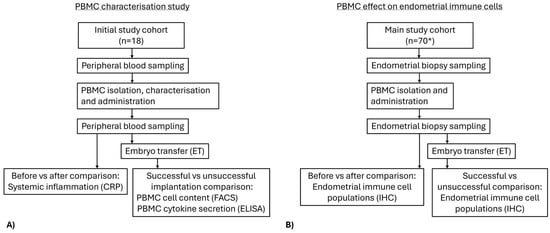 Flowchart of the study design. (A) Initial study on characterization of PBMC content and cytokine secretion and effect of PBMC administration on systemic inflammation and embryo transfer outcome. (B) Main study on before/after PBMC administration comparison of endometrial immune cell populations and ratios and embryo transfer outcome following PBMC treatment. * Total number of participants including those from the initial PBMC characterization study.