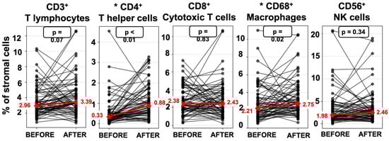 Connected dot plots of endometrial immune cells before and after PBMC administration. Red line: median values change. * Statistically significant difference.