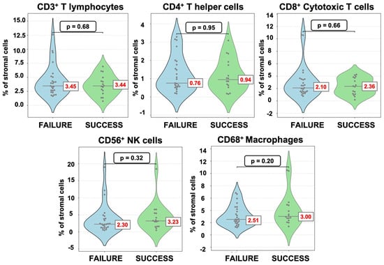 Among the 70 women included in the full cohort, 41 underwent embryo transfer, of which, 39% (16/41) achieved clinical pregnancy, while 61% (25/41) did not. The endometrial immune cell composition following PBMC administration, in terms of percentages of the stromal cells, did not differ significantly between the successful and unsuccessful groups. In contrast, the MΦ/T cell ratio was significantly higher in women with successful implantation outcome (1.15 [IQR 1.09]) compared to those with unsuccessful implantation (0.74 [IQR 0.60]; p = 0.024) (Table 4, Figure 4 and Figure 5).