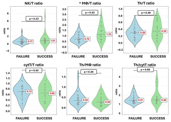 Violin dot plots of endometrial immune cell ratios after PBMC administration according to implantation outcome. * Statistically significant change.