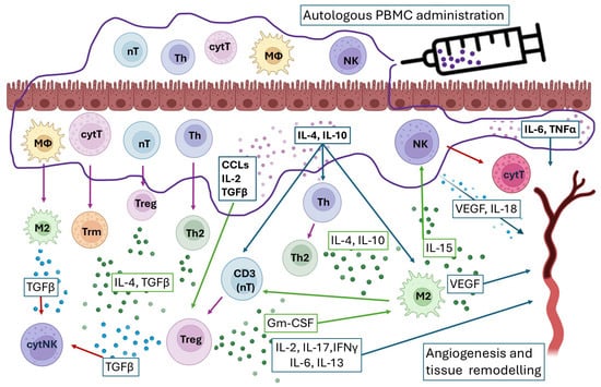 There are many hypotheses for the mechanism of action of PBMC on the endometrium. The local immunomodulatory effects could be due to the action of the cytokines secreted by PBMC placed in the cavity [,]. A 2021 study examined the peripheral and local balance of Treg and Th17 lymphocytes after PBMC administration in mice []. According to it, the expression of Treg and Th17-associated transcription factors and cytokines in the local endometrium changes after 2.5 days of PBMC administration. Since naive T cells require more time to proliferate and differentiate, it is possible that earlier changes are induced by the migration of systemic immune cells into the endometrium []. In other similar studies, Wang et al. and Qin et al. demonstrated that intrauterine exogenous PBMCs release cytokines (TGF-β and IL-2) and chemokines (CCL2, CCL17, CCL21, and CCL22), thereby regulating the intrauterine immune microenvironment and recruiting Treg cells to the endometrium [,].